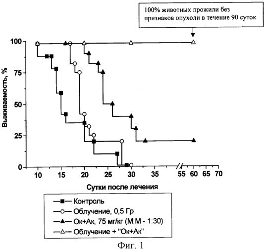 При комплексном лечении мышей с АОЭ с использованием лучевой терапии в дозе, равной 0,5 Гр, и БКС “Ок+Ак” в дозе, равной 75 мг/кг (по Ок; молярное соотношение Ок:Ак-1:30), в режиме – -излучение БКС “Ок+Ак” отмечали 100% излечение животных от опухоли (фиг.1, табл.1).