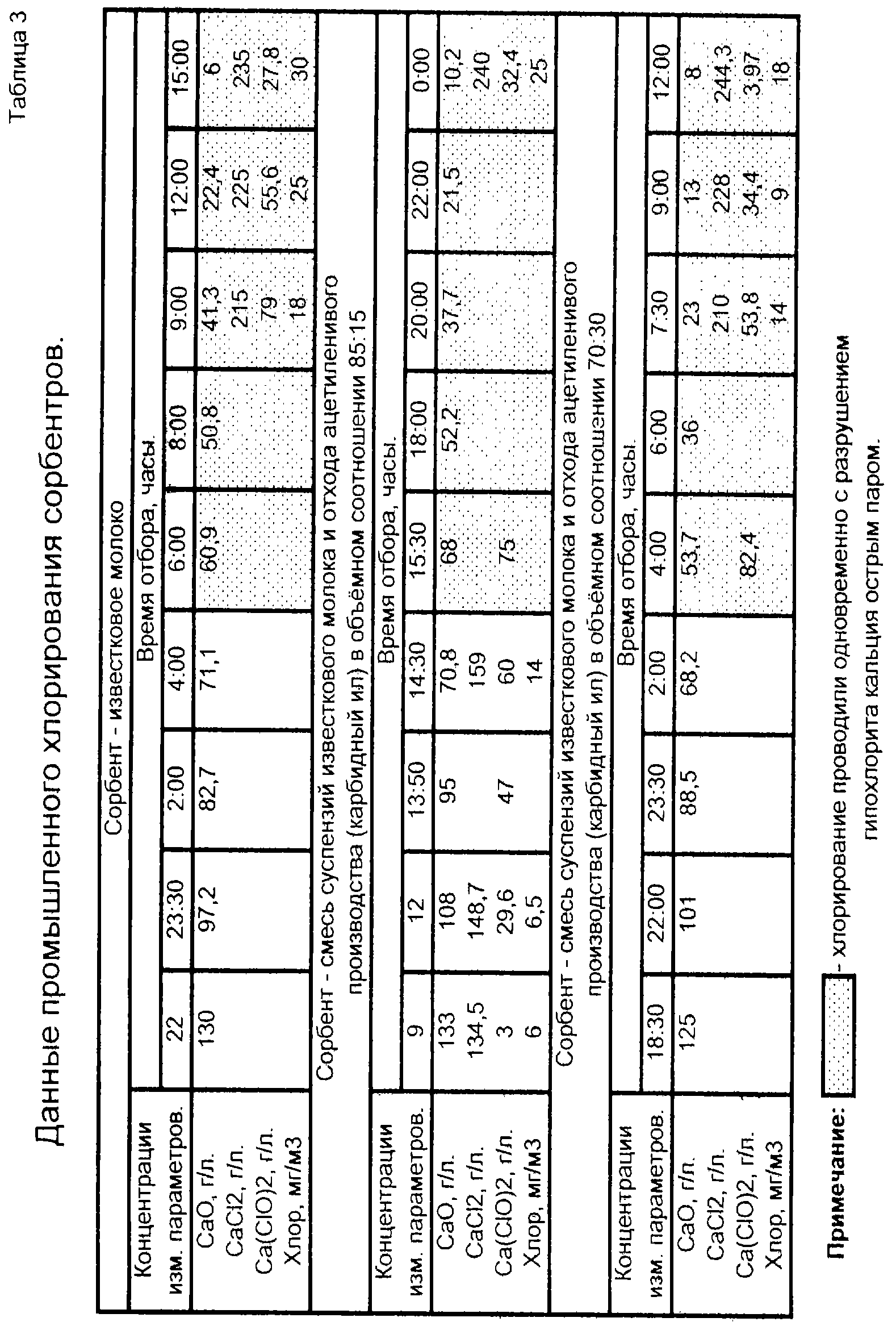 Хлорирование приготовленного сорбента хлоровоздушной смесью (ХВС) проводили в аппаратах горизонтального типа 5 (абсорберах). При прохождении ХВС с температурой 110-130°С через рабочее пространство абсорбера пульпа подогревалась только до температуры 35-40°С, достаточной для протекания основных процессов: диффузии хлора в газовой фазе, диффузии растворенного гидроксида кальция, гидролиза хлора, взаимодействия продуктов гидролиза хлора с гидроокисью кальция, что обеспечивает полноту поглощения хлора. При достижении концентрации окиси кальция 60-80 г/л обеспечивали подвод острого пара в первый отсек абсорбера, в зону максимального содержания хлора. Именно в этом отсеке достигался прогрев пульпы до 80°С, при которой начинается разрушение накопленного гипохлорита. Продолжительность обработки пульпы острым паром в течение 6-8 часов до конца хлорирования, т.е. до концентрации оксида кальция 6-20 г/л, не обеспечивает снижение содержания гипохлорита до 30 г/л.