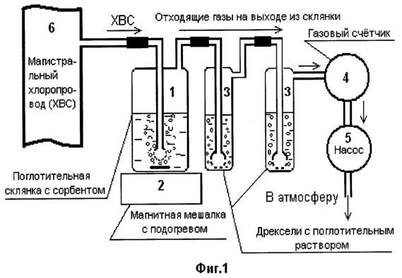 Хлорирование приготовленных сорбентов хлоровоздушной смесью (ХВС) проводили для определения концентрации хлора на выбросе из склянки с сорбентом за время хлорирования. Хлорирование проводили на лабораторной установке проточного типа (фиг.1), состоящей из последовательно соединенных поглотительной склянки 1 с магнитной мешалкой 2 для перемешивания сорбента, двух дрекселей 3 с поглотительным раствором – 10% раствором йодистого калия, газового счетчика 4 со шланговым вакуумным насосом 5. Установку подсоединяли к магистральному хлоропроводу 6. Концентрацию хлора в хлоровоздушной смеси (ХВС), проходящей по хлоропроводу со скоростью 1 л/мин, измеряли, пропуская 2 л ХВС через дрексели с раствором йодистого калия, а затем оттитровали выделившийся йод 0,1 н. раствором тиосульфата натрия, содержание хлора рассчитывали с учетом данных титрования объема пропущенной ХВС.