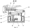 Рабочие органы чистки газоотводящих каналов 22 (см. фиг.3, 4 и 6) выполнены в виде спаренных плоских держателей 39, которые шарнирно закреплены на каретках 5 и 6 в горизонтальной плоскости. На свободных концах держателей 39 закреплены съемные скребки 40 плоской формы. Для установки скребков 40 в рабочее или исходное положение держатели 39 шарнирно соединены с тягой 41, снабженной пружиной сжатия 42, при этом свободный конец тяги 41 подвижно соединен с плечом 43 двуплечего рычага 44, шарнирно установленного на корпусе каретки 6. Другое плечо 45 рычага 44 снабжено роликом 46, взаимодействующим при перемещении каретки 6 с копиром 47 или 48, которые установлены со смещением относительно друг друга и закреплены на соответствующих боковых вертикальных стенках 49 и 50 каркаса.