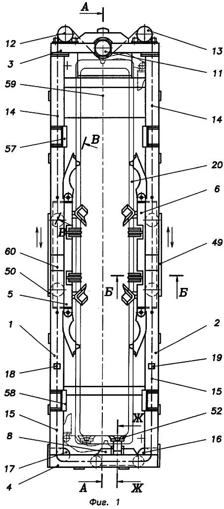 на фиг.3 – общий вид каретки, установленной в исходном положении, вид спереди с частичными разрезами;