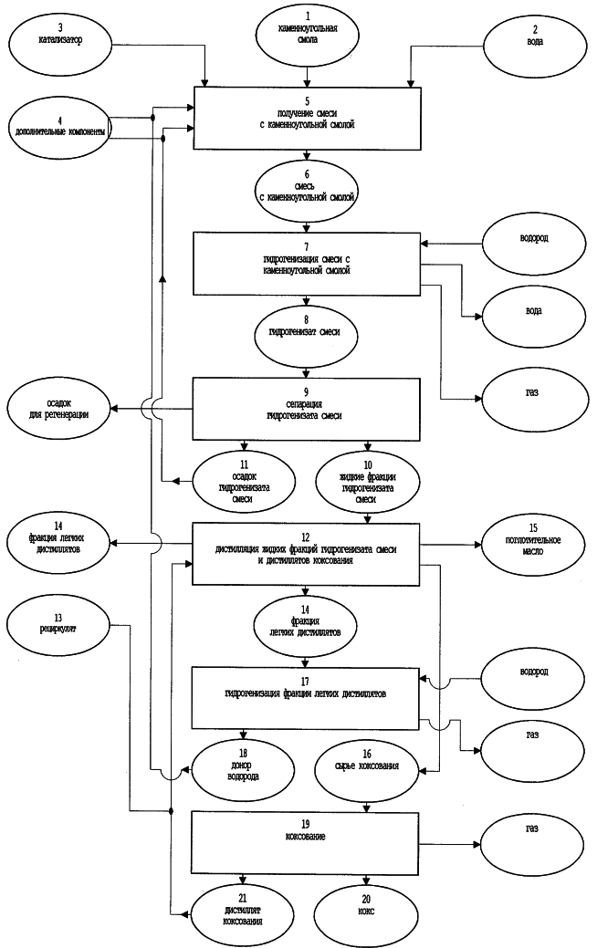 – гидрогенизация 7 смеси 6 с каменноугольной смолой и получением гидрогенизата 8 смеси;