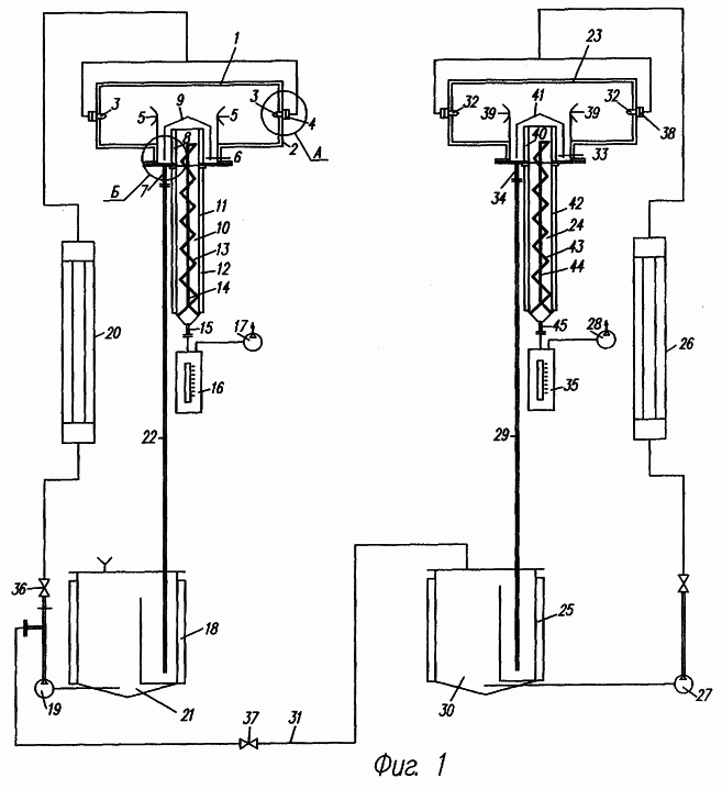 Пар по обогреваемой трубе 40 естественным ходом опускается вниз, входит в корпус 42 конденсатора 24. Здесь происходит конденсация пара топлива во всем объеме конденсатора 24 благодаря всеохватному интенсивному охлаждению пара топлива охлаждаемыми корпусом 42, змеевиком 43 и трубой 44. Температура в конденсаторе 10-12°С. Сконденсированное топливо из конденсатора 24 отводится через патрубок 45 в бак 35 сбора топлива.