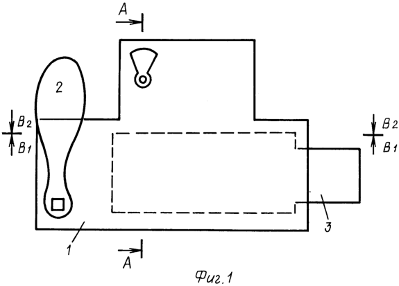 На фигуре 1 представлен вид корпуса 1 с управляющей ручкой 2 и засов 3, а также показана линия разреза на две части В1-В1.