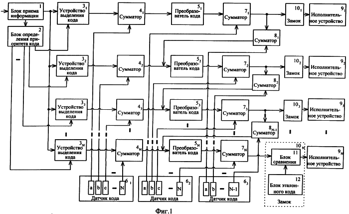 Блок 2 определения приоритета кода может быть выполнен в виде дешифратора, реализованного на микросхеме КР1533ИД7. Устройства 31, …, 3N выделения кода могут быть выполнены на регистрах, реализованных на микросхемах КР1533ИР22. Сумматоры 41, …, 4N, 71, …, 7N, 81, …, 8N-1 могут быть выполнены на элементах “ИСКЛЮЧАЮЩЕЕ ИЛИ”, реализованных на микросхемах КР1533ЛП5. Преобразователи 51, …, 5N кода могут быть выполнены в виде коммутируемых перемычек (см. Авторское свидетельство СССР №1807207, МКИ Е 05 В 47/00, опубл. 07.04.93 г., Бюл. №13). Датчики 61,…,63 кода и блок 12 эталонного кода могут быть выполнены на энергонезависимых ячейках памяти (см. Авторское свидетельство СССР №845287, МКИ Н 03 К 19/16, опубл. 02.07.79 г., Бюл. №25). Блок 11 сравнения может быть выполнен на микросхеме 1533СП1. Исполнительные устройства 91,…,9N представляют собой электромагнитные механизмы, управляемые составным транзистором.