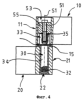 Палец 30 петли (см. также фиг.8) образует две области различного диаметра. Первая область 33 несколько большего диаметра расположена в центральном, овальном в поперечном сечении отверстии 53 в шарнирной части 11 части 10 петли и заполняет ее в поперечном сечении в направлении, поперечном направлению сдвига. Эта область 33 пальца 30 петли может, таким образом, перемещаться в отверстии 53 только в направлении сдвига.