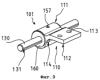 Часть 110 петли включает в себя шарнирную часть 111, которая с ней выполнена за одно целое и имеет, по существу, цилиндрическую внешнюю форму. Часть 110 петли имеет плоскую крепежную область 112, которая служит для крепления на двери, окне или подобном устройстве, для чего предусмотрены соответствующие отверстия 113 для введения крепежных средств, например винтов.