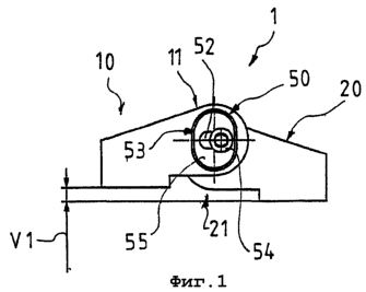 Видно, что винт 51 с головкой, служащий в качестве части пальца петли или выступа, как уже описано, проходит через удлиненное отверстие 52 элемента 55 и ввинчен в резьбовое отверстие 35 в торцевой стороне пальца 30 петли. Резьбовое отверстие для приема винта 51 с головкой размещено, как, в частности, следует из фиг.8, эксцентрично относительно оси S1 вращения пальца 30 петли, так что винт 51 размещен эксцентрично к оси вращения пальца петли.