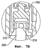 Более подробно, как показано на фиг.7А, электронный модуль 82 установлен в камере 80. Обратный клапан 94 предотвращает обратный поток из труб через выпускной канал 74. Шаговый двигатель 84 вращает шестерню 202, которая через червячную передачу 204 поднимает и опускает корпус 206. Корпус 206 зацепляет седло 208, которое регулирует поток внутри отверстия 210. Как показано более подробно на фиг.7В, плечо 212 имеет конфигурацию для дополнительного зацепления сопряженной втулки на корпусе 206, когда клапан закрыт. Эта конфигурация “корпуса” клапана, как полагают, является предпочтительной конструкцией, с точки зрения механики текучих сред, по отношению к альтернативному осуществлению конфигурации игольчатого клапана на фиг.10В. Так, поток текучей среды из впускного канала 72, истекший из соединения корпус 206/седло 208, позволяет осуществить точную регулировку текучей среды без чрезмерного износа поверхности раздела.