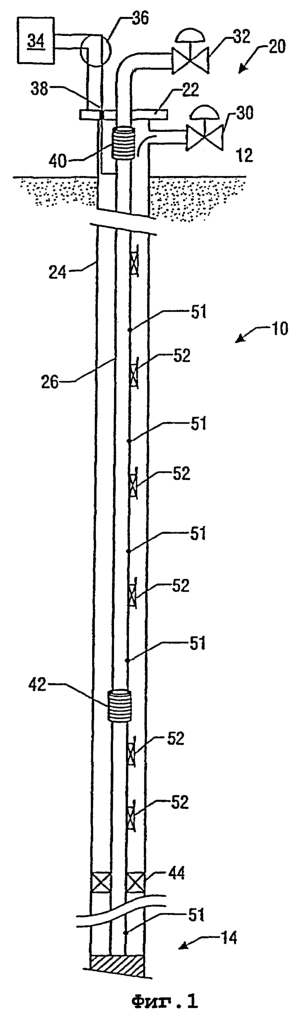 Производственная платформа 20 схематически изображена над поверхностью 12 на фиг.1. Стандартное устье скважины, имеющее подвеску 22, содержит трубы 26, подвешенные на подвеске 22 и поддерживаемые ею. Обсадная колонна 24 является стандартной, то есть она типично зацементирована в буровой скважине во время завершения скважины. Аналогично, колонна труб 26 обычно является стандартной, содержащей множества удлиненных трубчатых секций производственных труб, соединенных нарезными муфтами на конце секции труб. Дроссели 30 для впуска газа применяют для обеспечения прохода сжатого газа внутрь кольцевого пространства между обсадной колонной 24 и трубами 26. Наоборот, выходной клапан 32 осуществляет выпуск нефтяных и газовых пузырей из внутреннего пространства труб 26 во время добычи нефти.