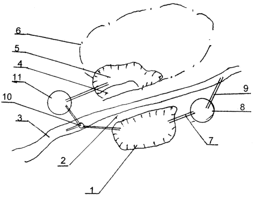 На чертеже позиции обозначают: 1 – вспомогательная траншея, 2 – естественная фильтрующая перемычка, 3 – река, 4 – внутренний отвал основной траншеи, 5 – основная траншея, 6 – контур развития основной траншеи, 7 – водовод из траншеи в отстойник, 8 – отстойник вспомогательной траншеи, 9 – водовод из отстойника в реку, 10 – затвор-распределитель, 11 – отстойник основной траншеи.