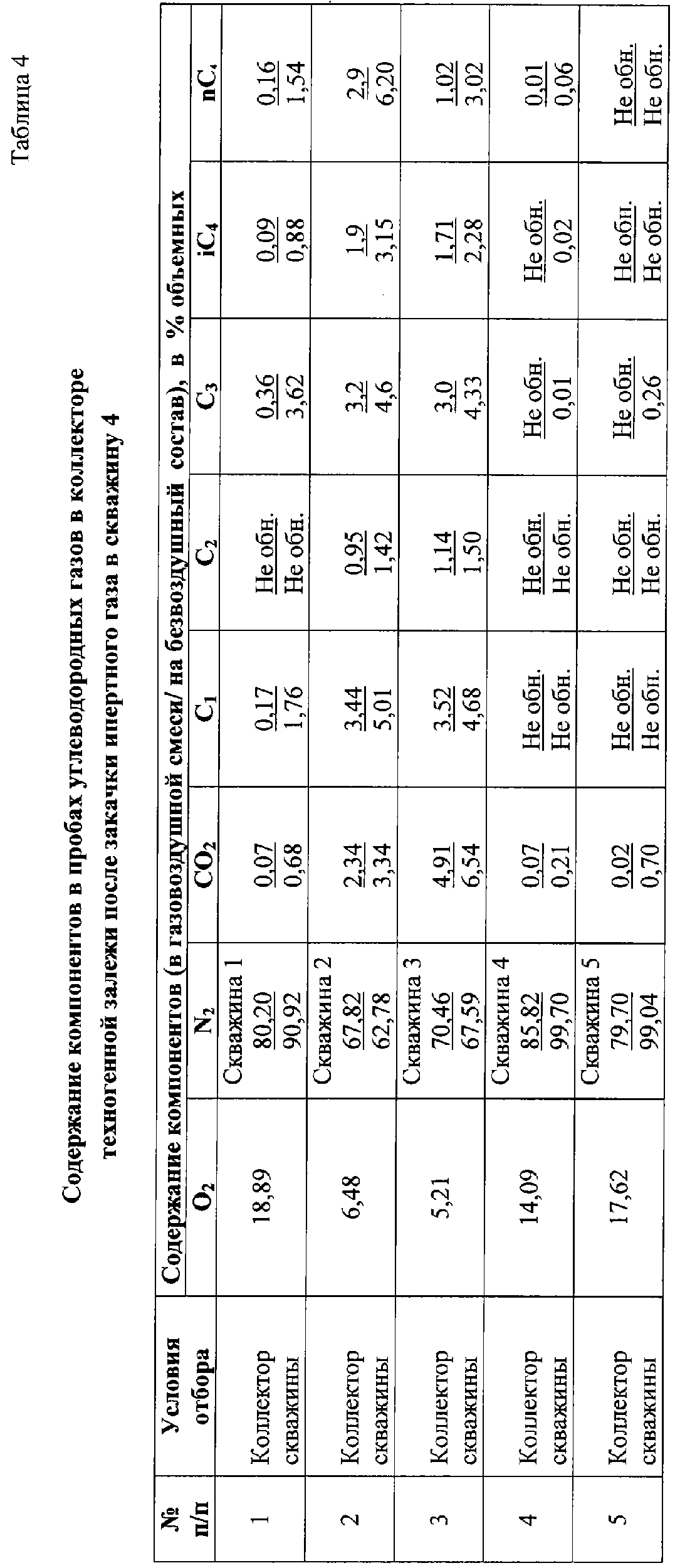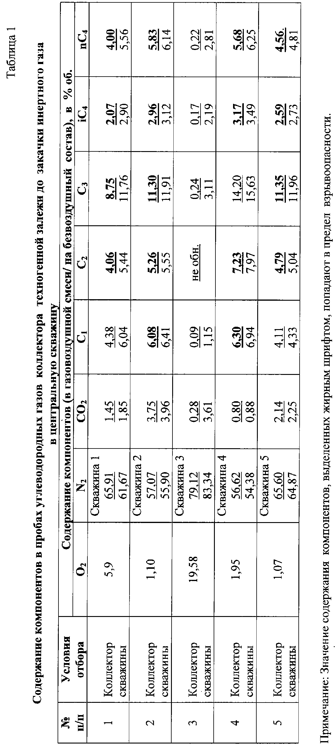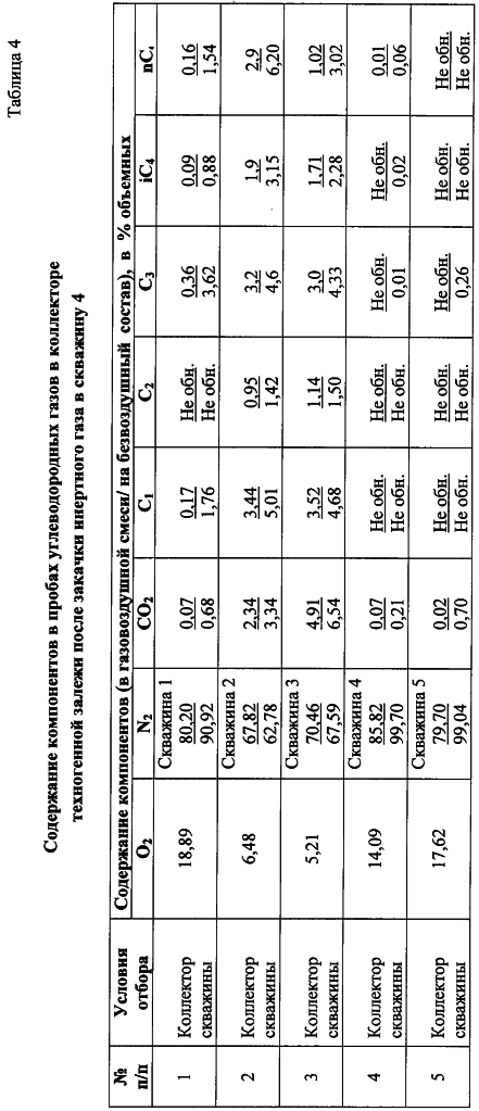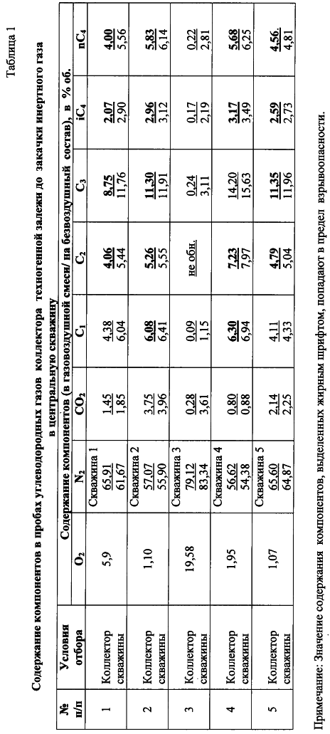 Изобретение относится к нефтегазодобывающей и нефтеперерабатывающей промышленности. Технический результат заключается в создании способа, применимого для ликвидации техногенных залежей углеводородных газов в приповерхностных массивах горных пород при разработке нефтяных и газовых месторождений, при одновременном достижении содержания углеводородных газов (метана и его гомологов) в техногенной залежи ниже пределов взрывоопасных величин. Для этого определяют глубину коллектора залежи и основные направления трещиноватости (ОНТ) массива горных пород в контуре техногенной залежи и узлы их пересечения. На контуре техногенной залежи устанавливают ориентировочный центр залежи, в ближайшем к указанному центру залежи узле пересечения ОНТ бурят центральную скважину на глубину коллектора залежи (ГКЗ) и ее устье оборудуют устройством для закачки газа. Затем вокруг нее, с учетом ранее установленных ОНТ, производят бурение также на ГКЗ дополнительно по меньшей мере четырех разгрузочных скважин (PC). В каждой пробуренной скважине на ГКЗ определяют начальную концентрацию углеводородных газов, а именно, концентрацию метана и его гомологов. В центральную скважину производят закачку инертного газа с одновременным определением концентрации метана на устье PC, при этом закачку продолжают до достижения нижнего предела взрывоопасной величины по метану на устье как минимум в одной PC. После этого из ряда PC выделяют скважину с наиболее высокой концентрацией метана, переносят на нее функцию центральной скважины и производят закачку через эту PC инертного газа, выполняя замеры концентраций метана на устье всех остальных скважин. Указанный процесс переноса функции центральной скважины на другие PC повторяют до достижения концентрации метана на устье всех пробуренных скважин не выше нижнего предела взрывоопасной величины по этому газу. После этого закачку инертного газа прекращают. В каждой из ранее пробуренных скважин на ГКЗ вновь определяют концентрацию метана и его гомологов. При ее значении выше нижнего предела взрывоопасной величины хотя бы в одной из указанных скважин, повторяют цикл закачки инертного газа по вышеуказанной схеме до достижения концентрации метана и его гомологов в скважинах на ГКЗ не выше нижнего предела взрывоопасной величины для этих газов. После чего все ранее пробуренные скважины закрывают, оставляя их для проведения периодического контроля за концентрациями углеводородных газов в коллекторе. 2 з.п. ф-лы, 4 табл.