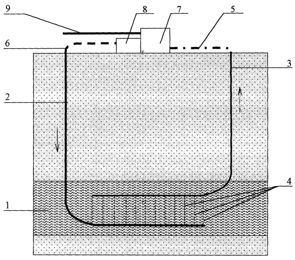 Способ извлечения метана из угольного пласта 1 осуществляется следующим образом. Угольный пласт 1 вскрывают скважинами направленного бурения – нагнетательной 2 и добычной 3. Горизонтальные стволы скважин 2 и 3 перфорируют по длине. Направленным радиальным гидроразрывом жидкостью на основе широкой фракции легких углеводородов создают фильтрационные каналы 4 и отбирают по добычной скважине 3 свободный газ. Затем в угольный пласт 1 с помощью насосной станции 8 через наземный трубопровод 6 нагнетательной скважины подают по нагнетательной скважине 2 вещество с большей, чем у метана, сорбционной способностью – широкую фракцию легких жидких углеводородов, например соляровый дистиллят или керосин. Проходя по естественным трещинам и порам угольного пласта 1, а в основном по созданным фильтрационным каналам 4, широкая фракция легких углеводородов будет сорбировать метан из угля. При формировании газовых коллекторов на глубинах до 2000 м кинетика десорбции метана позволяет растворять в одной части широкой фракции легких углеводородов до 1000 частей метана. Десорбционные свойства обусловлены гидрофобизацией поверхности угля и способствуют разрушению химических связей молекул углерода с молекулами метана. Вещество, насыщенное метаном, вытесняют по добычной скважине 4, далее по наземному трубопроводу 5 добычной скважины подают на станцию 7 сепарации, в которой метан отделяют от широкой фракции легких углеводородов. Затем газ по трубопроводу 9 для добытого газа отправляют потребителю, широкую фракцию легких углеводородов подают в угольный пласт 1 для насыщения. По мере отработки запасов метана в угольном пласте 1 в работу включаются скважины, расположенные радиально относительно нагнетательной скважины. Для снижения стоимости добываемого газа путем снижения объемов бурения дополнительных скважин возможно использование пучка радиально направленных горизонтальных стволов из одной вертикальной нагнетательной скважины. Рекомендуется располагать горизонтальные стволы нагнетательных скважин 2 ниже горизонтальных стволов добычных скважин 3 для обеспечения наиболее эффективной фильтрации реарентов и сорбции метана.