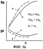 – при неизменном рабочем объеме и номинальной мощности повышают среднее давление Ре при снижении номинальной частоты вращения. В этом случае при сохранении мощностных характеристик транспортного средства повышается экономичность двигателя за счет повышения механического КПД (см. фиг.5б, где кривые, обозначенные позицией х, относятся к обычному двигателю, а кривые, обозначенные позицией у, относятся к двигателю с переменной степенью сжатия);