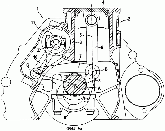 Предлагаемый в изобретении поршневой ДВС 1 показан на фиг.6а и 6б и имеет корпус 2 с цилиндром 3 и установленным в нем поршнем 4, шатун 6, который шарнирно соединен одним концом с поршнем 4, кривошип 8 коленчатого вала, установленного в корпусе 2, прицепной шатун 10, называемый также управляющим рычагом 10 и шарнирно соединенный одним его концом с корпусом 2, и треугольный поперечный рычаг 7, который одной его вершиной шарнирно соединен со вторым концом шатуна 6, второй его вершиной шарнирно соединен с кривошипом 8, а третьей его вершиной шарнирно соединен с прицепным шатуном 10. Для регулирования степени сжатия ось качания прицепного шатуна 10, т.е. точка Z его шарнирного соединения имеет возможность перемещения по управляемой траектории, определяемой, например, эксцентриком или дополнительным кривошипом 11.