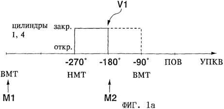 на фиг.1а и 1б – диаграммы, на которых показаны положения клапанов четырех цилиндров при выбеге ДВС,