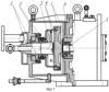 Жидкость под давлением через кольцевой зазор между наружной поверхностью трубы 2 и кожухом 1 подается в корпус 4, при этом воздух вытесняется через отводной канал черпака 3 и трубы 2, но воздух вытесняется не полностью – часть остается (в объеме, расположенном выше уровня входного отверстия канала черпака). После включения черпакового насоса корпус 4 начинает вращаться и с помощью радиальных лопаток приводит во вращательное движение жидкость, которая под действием центробежной силы направляется к периферии корпуса 4, входит в канал черпака 3 и трубы 2, при этом часть воздуха отводится вместе с жидкостью в канал, а другая часть перемещается с периферии корпуса 4 в центр зазора (в зону с наименьшим давлением), при этом в центре зазора образуется воздушная подушка.