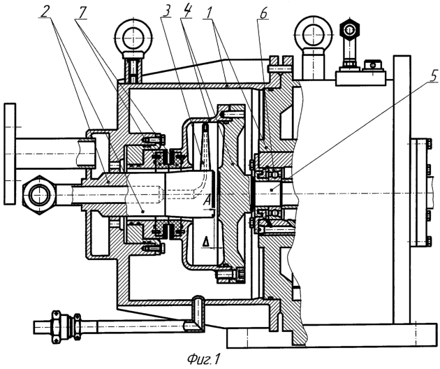 Насос состоит из кожуха (неподвижного корпуса) 1, на котором консольно закреплена труба 2, на которой, в свою очередь, закреплен черпак 3. Вращающийся корпус 4 закреплен на валу 5, который установлен в неподвижном корпусе на радиально-упорных шарикоподшипниках 6. Разъем между кожухом 1 и вращающимся корпусом 4 герметизируется с помощью торцевого уплотнения 7, установленного на всасе (со стороны низкого давления). В черпаке 3 и трубе 2 выполнен канал для отвода жидкости, на вращающемся корпусе 4 в зоне, ограниченной наружным диаметром трубы 2 и внутренним диаметром корпуса 4, выполнены радиальные лопатки, а в зоне от центра корпуса 4 до диаметра, примерно равного наружному диаметру трубы 2, выполнены профилированные радиальные выступы, при этом между торцом консольно закрепленной трубы 2 и корпусом 4 выполнен зазор ~0,02D.