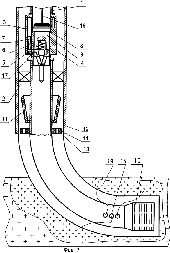 Струйный насос 3 установлен в обсадной колонне 12 над продуктивным пластом 19 скважины. Ниже дополнительного пакера 11 на колонне труб 1 расположено центрующее пакер 11 в обсадной колонне 12 кольцо 13. В центрующем кольце 13 выполнены сквозные отверстия 14, а в колонне труб 1 над автономным каротажным комплексом 10 выполнены отверстия 15.