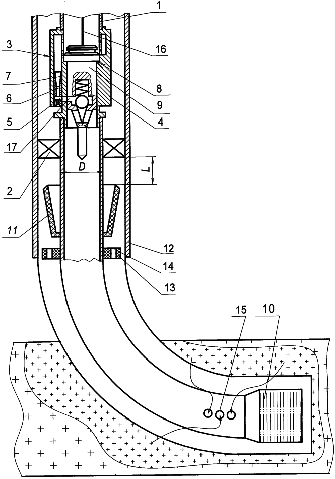 Дополнительный пакер 11 выполнен из эластичного материала в виде открытого сверху стакана с конусообразной боковой стенкой. Дно стакана герметично закреплено на колонне труб 1. Расстояние L между пакерами 2 и 11 составляет не менее наружного диаметра D колонны труб 1 в месте установки дополнительного пакера 11.