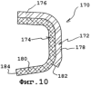 На Фиг.10 изображено уплотнительное кольцо, аналогичное описанному выше и изображенному на Фиг.4, в виде манжеты 170. Манжета 170 содержит уплотнительный корпус, изготовленный из слоистой структуры, включающей полимерный материал, описанной выше и представленной на Фиг.3. Манжетный уплотнительный корпус содержит металлическую подложку 172 и слой уплотнительного полимерного материала 174, обладающий малым коэффициентом трения, приклеенного по меньшей мере к части подложки. Уплотнительный полимерный материал 174 вводится в упругий контакт с уплотняемой поверхностью для обеспечения герметичного уплотнения между ними. Уплотняемая поверхность может быть неподвижной относительно уплотнительного полимерного материала 174.
