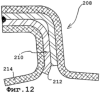 На Фиг.12 изображено уплотнительное кольцо 208, сходное с описанным выше и изображенным на Фиг.11, за исключением того, что одна из металлических подложек 210 имеет внутренний диаметр 212, выполненный с отклонением в осевом направлении, или “отгибом”. Такое отклонение создается для создания посредством его требуемого прижима уплотнительного элемента 214 для обеспечения прижима уплотнительного элемента в осевом направлении вперед, что необходимо для улучшения уплотняющего эффекта уплотнения. Такое отклонение может быть выполнено во время процесса изготовления.