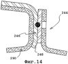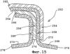 На Фиг.14 изображено уплотнительное кольцо 244, выполненное согласно способу по настоящему изобретению из двух соединенных между собой слоистых структур, включающих полимерный материал, как описано выше и изображено на Фиг.3. Этот вариант выполнения уплотнительного кольца сходен с описанным выше и изображенным на Фиг.13, за исключением того, что металлическая подложка 246 включает край 248 внутреннего отверстия, выполненный с отклонением в осевом направлении, или “отгибом”, предназначенным для приложения посредством его требуемой прижимной силы к уплотнительному элементу 250. Такое отклонение обеспечивает прижим уплотнительного элемента 250 в осевом направлении, что необходимо для улучшения уплотняющего эффекта уплотнения. Такое отклонение может быть выполнено во время процесса изготовления.