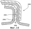 На Фиг.16 изображено уплотнительное кольцо 280, выполненное согласно способу по настоящему изобретению из двух соединенных между собой слоистых структур, включающих полимерный материал, как описано выше и изображено на Фиг.3. Этот вариант выполнения уплотнительного кольца сходен с описанным выше и изображенным на Фиг.15, за исключением того, что металлическая подложка 282 включает край 284 внутреннего отверстия, выполненный с отклонением в осевом направлении, или “отгибом”, предназначенным для приложения посредством его требуемой прижимной силы к уплотнительному элементу 286. Такое отклонение обеспечивает прижим уплотнительного элемента 286 в осевом направлении, что необходимо для улучшения эффекта уплотнения. Такое отклонение может быть выполнено во время процесса изготовления.