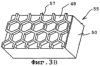 Кроме того, слоистая структура, включающая полимерный материал, может быть изготовлена путем специальной обработки поверхности полимерного слоя, как это описано в патенте США №5971617. На Фиг.3В показан примерный вариант исполнения такой слоистой структуры 55, где слой 48 полимерного материала подвергли определенной поверхностной обработке с образованием рельефных элементов 57, выступающих от нее вверх. В этом конкретном варианте исполнения рельефные элементы имеют шестиугольную форму. Следует, однако, иметь ввиду, что конкретную конфигурацию поверхности слоя полимерного материала можно изменять в зависимости от конкретной конструкции уплотнительного устройства и от конкретного вида применения уплотнения.