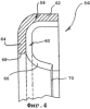 Металлическая подложка 58 выполнена в виде жесткого корпуса, изготовленного так, чтобы облегчить его сцепление с сальником и создавать требуемый прижим, или прикладывать силовую нагрузку к уплотнительному полимерному материалу 60 при установке около уплотняемой поверхности, например подвижной поверхности вала. В данном варианте исполнения корпус 58 содержит расположенную в осевом направлении поверхность 62, переходящую через радиально изогнутую часть под углом, приблизительно составляющим 90°, в радиально направленную поверхность 64. Следует иметь ввиду, что это только один пример конструкции манжеты и что объемом настоящего изобретения предусмотрены и другие конструкции манжет.