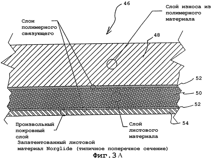 В варианте исполнения, приведенном в качестве примера, слоистая структура, включающая полимерный материал, выполнена в виде металлического листа, покрытого тетрафторэтиленом (ETFE), которая коммерчески поставляется фирмой Saint Gobain Corporation под торговой маркой Norglide. Если это необходимо, то слоистая структура, включающая полимерный материал, может содержать дополнительный (опционный) покровный слой 54, расположенный сверху открытой поверхности подложки 50, например, с целью защиты поверхности подложки от повреждения во время последующего обращения с ним. Покровный слой 54 приклеивают к подложке путем использования связующего вещества 52, выбранного из ряда связующих веществ, приведенного выше.