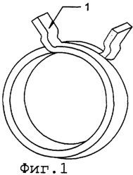 Пружинный хомут образован свернутой в кольцо пластиной из пружинящего материала с наружными радиальными отгибами 1. Диаметр кольца хомута в свободном состоянии меньше, чем диаметр кольца в рабочем и разведенном состоянии. В разведенном состоянии радиальные отгибы находятся в контакте между собой, в рабочем и свободном состоянии – на некотором расстоянии друг от друга (фиг.1, 2, 3 и 5).