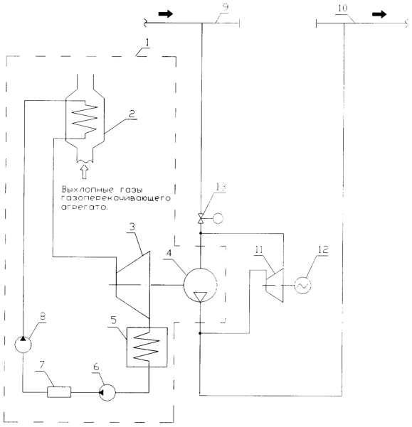 Техническая задача изобретения – расширить возможность применения тепловой энергии выхлопных газов газоперекачивающих агрегатов на компрессорной станции. Обеспечить использование энергии выхлопных газов для компримирования магистрального газа и выработку электрической энергии для потребителей компрессорной станции.