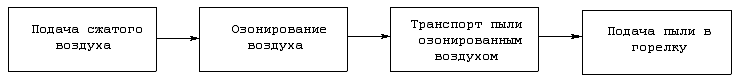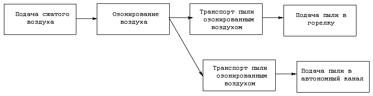 Схема содержит источник высоконапорного воздуха 1, воздухопровод 2, пылеподающее устройство 3, смеситель 4, между источником высоконапорного воздуха 1 и смесителем 4 расположен озонатор 5, смеситель 4 соединен с горелками 6 с помощью трубопровода.