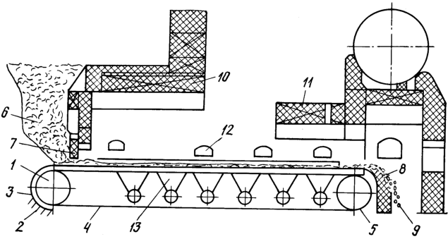 За ведомой звездочкой 5 расположен шлакосниматель 8, ниже него золовой бункер 9. Над цепной решеткой расположены лучеиспускающие своды 10 и 11. В стенках топки установлены боковые дверцы 12. Под решеткой расположены дутьевые секции 13.