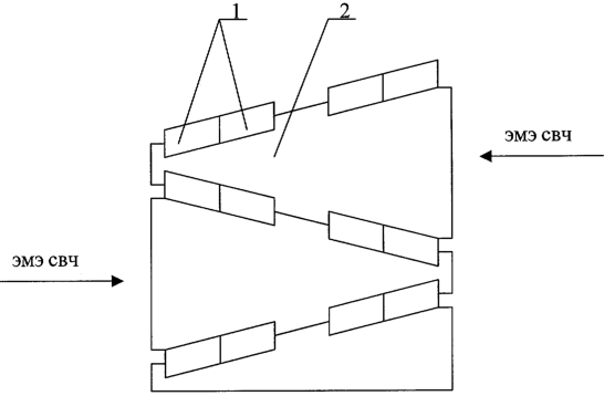 Изобретение решает задачу увеличения скорости сушки за счет увеличения глубины проникновения ЭМЭ СВЧ в штабель пиломатериалов.