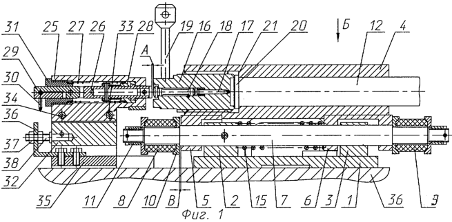 Стенд содержит также ударный механизм, который расположен в корпусе 25 и состоит из ударника 26, боевой пружины 27, втулки 28, чеки 29, кольца 30 и гайки 31. Корпус 25 ударного механизма установлен в основании 32 и фиксируется в нем с помощью штифта 33 и съемного штыря 34. Основание 32 размещено на плите 35 с возможностью регулировки его положения при помощи угольника 36, гайки 37 и шпильки 38. Плита 35 и неподвижное основание 1 жестко закреплены на базовой плите 36 стенда.
