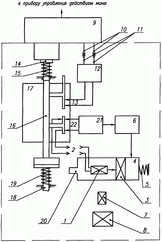 Для подключения запального устройства к прибору управления действием мины служит соединитель 9, имеющий вилку 10, а напротив этих элементов в ЗУ расположены гнезда 11, электрически связанные с защитным электрическим контуром в виде LC-фильтров 12 с выходными контактами 13, и сигнальный стопор 14 с пружиной 15, упирающийся в шток 16 микропереключателя 17. Другим концом шток 16 микропереключателя 17 упирается в блокирующий стопор 18 с пружиной 19. Сигнальный стопор 14, шток 16 микропереключателя 17, блокирующий стопор 18 совместно с выступом 20 на движке 4 составляют блокирующее устройство данного ЗУ.