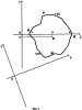 После этого, для упрощения дальнейших расчетов координат геометрического центра строят на карте рассматриваемого участка территории и/или населенного пункта дополнительную прямоугольную систему координат, таким образом, чтобы ось Х дополнительной системы координат проходила через крайние западную и восточную точки границы участка территории и/или населенного пункта, а ось Y была перпендикулярна оси X. Таким образом, рассматриваемый участок территории и/или населенный пункт будет располагаться в первом и четвертом квадрантах дополнительной системы координат (фиг.1). Дальнейшие вычисления площади рассматриваемого участка территории и/или населенного пункта и координат его геометрического центра производят в построенной специально для этого дополнительной системе координат. Полученные результаты вычислений переводят затем из дополнительной в основную систему координат по формулам:
