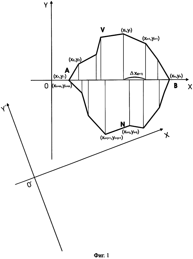 – f1(x), f2(х) – уравнения, соответственно, верхней (AVB) части и нижней (ANB) части границы участка территории и/или населенного пункта в дополнительной системе координат (см. фиг.2);