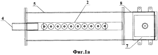 Заявляемый многолинейчатый источник спектральный излучения с общим генератором возбуждения (фиг.1) включает набор шариковых ламп 1, установленных в кассету 2. Для выхода спектрального излучения используется окно 3 с дросселем 4, выполненным в виде металлической сетки, практически прозрачной для оптического излучения, но не прозрачной для СВЧ поля из прямоугольного волновода 5. Для регулировки возбуждения ламп 1 используются индивидуальные регулировочные шайбы 6, а для их возбуждения – СВЧ излучение от магнетрона 7, поступающее через магнетронную секцию волновода 8.