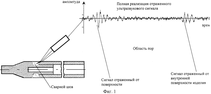 Изобретение относится к акустическим методам неразрушающего контроля и может быть использовано для определения качества сварных швов тепловыделяющих элементов. Согласно способу, пьезопреобразователь устанавливается под углом к изделию таким образом, чтобы в изделии распространялись только поперечные волны. В каждой точке контроля фиксируют полную реализацию отраженного ультразвукового сигнала, проводят сглаживание и выделение огибающей этой реализации и после сканирования всего сечения сварного шва строят изображение сечения. Определяют границы области наличия пор вычислением центров тяжести изображений внешней и внутренней поверхности изделия. Производят поиск максимумов амплитуды сигналов в этой области и по координатам центров тяжести изображений, содержащих максимумы сигналов, определяют координаты и размеры пор. В результате повышается точность контроля и выявляются дефекты типа “пора” в тонкостенных изделиях. 2 ил.