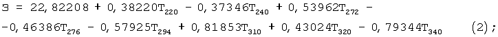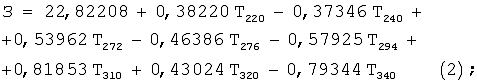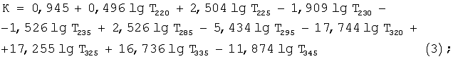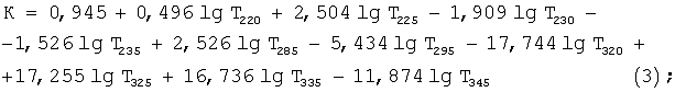 Изобретение относится к контролю качества пищевых продуктов, в частности чая. Известен способ определения качества чая путем взвешивания золы после сжигания взвешенной пробы чая и расчета ее содержания по отношению веса золы и веса пробы; взвешивания высушенного экстракта, полученного из взвешенной пробы чая и расчета содержания экстрактивных веществ по отношению веса высушенного экстракта и веса пробы; экстрагирования пробы чая водным раствором аммиака в хлороформе, сушки экстракта, обработки соляной кислотой, добавления раствора йода, фильтрации и титрования тиосульфатом натрия, по результатам которого рассчитывают содержание кофеина (ГОСТ 1938). Недостатком этого способа является высокая трудоемкость, связанная с необходимостью проведения отдельной серии опытов для определения каждого из перечисленных качественных показателей. Техническим результатом изобретения является снижение трудоемкости за счет сокращения количества серий опытов. Этот результат достигается тем, что способ определения качества чая по содержанию экстрактивных веществ, золы и кофеина предусматривает измельчение чая, его экстрагирование кипящей дистиллированной водой, приготовление пробы, соответствующей 40 мг чая на 500 мл дистиллированной воды, измерение светопропускания пробы в диапазоне длин волн 200-359 нм и расчет качественных показателей по следующим уравнениям: где ЭВ – содержание экстрактивных веществ, %; З – содержание золы, %; К – содержание кофеина, %; Ti – светопропускание при длине волны i, %. Способ реализуется следующим образом. Пробу чая отбирают и готовят по традиционной методике согласно ГОСТ 15113.0. Отобранную пробу измельчают и экстрагируют кипящей дистиллированной водой, соответствующей ГОСТ 6709. Экстракт фильтруют через фильтровальную бумагу, соответствующую ГОСТ 12026. Фильтрат разбавляют дистиллированной водой до концентрации, соответствующей 40 мг чая на 500 мл дистиллированной воды. Полученный раствор помещают в спектрофотометр, на котором измеряют светопропускание в диапазоне длин волн 200-359 нм. Измерение проводят при непрерывном измерении длины волны, выводя результаты измерений на графопостроитель, или измеряют светопропускание только для тех значений длин волн, которые входят в приведенные выше расчетные зависимости (1)-(3), или осуществляют измерения при дискретном изменении длины волны с шагом 5 нм с последующей аппроксимацией экспериментальных данных в виде графика, с которого снимают данные, соответствующие длинам волн, входящим в расчетные зависимости (1) – (3). Далее по зависимостям (1)-(3) осуществляют расчет качественных показателей чая. Пример. Для испытаний используют чай черный байховый 1, 2 и 3 сорта 000 “Адлерская чайная фабрика”. Из каждой партии чая отбирают и готовят пробу, как это описано выше. Измерение светопропускания осуществляют на спектрофотометре СФ-46. Измерения осуществляют при дискретном изменении длины волны с шагом 5 нм. Поскольку величина интервала измерений не кратна 5 нм, их начинают с 200 нм и завершают на 360 нм. Данные измерений аппроксимируют непрерывной гладкой линией с использованием пакета программ Statistica. С полученного графика снимают значения светопропускания для длин волн, которые не кратны 5 нм. По формулам (1)-(3) осуществляют расчет качественных показателей чая каждого сорта. Резу