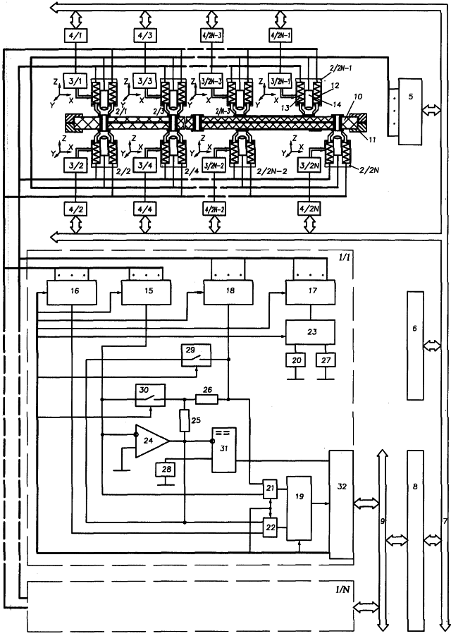 Интерфейс 7 предназначен для информационной связи микро-ЭВМ 6 с адаптером 8, 2N блоками управления перемещением 4, блоком ввода видеоизображения 5. В качестве интерфейса 7 может быть использована системная шина PCI фирмы “PCI SIG” [9].