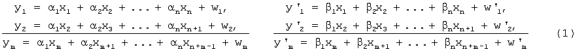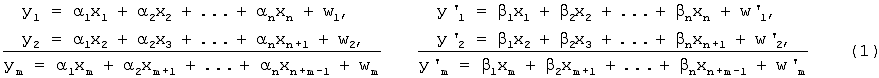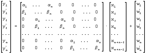 Другой подход к расчету весовых коэффициентов при наличии измерений двух каналов (1) сводится к следующему. Модель (1) представляется в виде матричного уравнения Y=F· X+W, где Y – вектор-столбец 2m измерений, F – матрица коэффициентов размерности (2m)× (m+n-1), Х – вектор-столбец m+n-1 неизвестных параметров, W – вектор-столбец 2m ошибок измерения:
