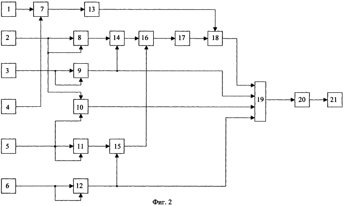 Первый 2 и второй 5 измерители высот полета воздушных судов ВС1 и ВС2 определяют высоты полета h1, h2 соответственно. Сигнал h1, пропорциональный высоте полета первого ВС1, поступает на первый и второй входы первого блока умножения 8 и на первый вход третьего блока умножения 10. Сигнал, пропорциональный h1 2, с выхода первого блока умножения 8 поступает на первый вход второго сумматора 14.