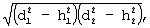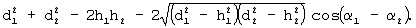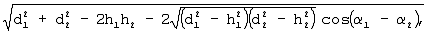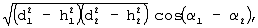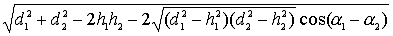 С выхода шестого блока умножения 16 сигнал, пропорциональный (d1 2-h1 2)(d2 2-h2 2), поступает на вход первого блока вычисления корня квадратного 17, с выхода которого сигнал, пропорциональный поступает на второй вход седьмого блока умножения 18, на первый вход которого поступает сигнал, пропорциональный cos( 1– 2). С выхода седьмого блока усножения 18 сигнал, пропорциональный поступает на первый вход четвертого сумматора 19.