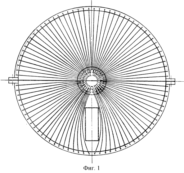 Устройство работает следующим образом. Витки изготовлены из единого провода или соединены так, что ток течет по ним в одну сторону в центральных полутрубах и в противоположную сторону на внешних полутрубах. Симметричное расположение внешних участков витков обеспечивает аксиально-симметричное поле типа 1/r между центральной и внешней частями обмотки. При этом внешнее поле очень близко к нулю уже на расстояниях в несколько сантиметров. Решение дает возможность получить поле такой конфигурации в большом объеме, что отличает его от прототипа. Если использовать полный ток порядка 1 Мегаампера, то напряженность поля во всем объеме будет достаточной для транспортировки протонов и электронов от распада нейтронов. При вводе пучка нейтронов через окна в торцевых или боковых стенках камеры вдоль центральной шины или перпендикулярно к ней можно осуществить сбор протонов и электронов от распавшихся при пролете камеры нейтронов и зарегистрировать их с помощью детекторов, расположенных внутри камеры, непосредственно вблизи радиальных торцевых элементов обмотки. Т.е. телесный угол сбора частиц распада из определенной зоны пучка равен 4 , т.е. реализуется максимально возможная светосила. Контролируемая длина пучка определяется длиной камеры и техническими возможностями по намотке магнита. Представляется, что длина около 2 м и диаметр около 0,8 м вполне достижимы с технической точки зрения.