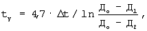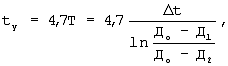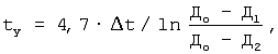 Таким образом, количественной характеристикой турбулентности ионосферы служит дисперсия плотности электронной концентрации слоя F2. Нарастающая раскачка очага землетрясения в литосфере сопровождается возрастающей турбулентностью ионосферы. Функция изменения турбулентности ионосферы во времени накануне удара представлена графиком фиг.3. Эту функцию получают, отслеживая динамику изменения fкр обнаруженной аномалии по серии последовательных измерений на витках орбиты КА. Из математики известно (см., например, Н.С.Пискунов “Дифференциальное и интегральное исчисления”, учебник для ВТУЗов, 5-е издание, М., Наука, 1964 г., стр.458), что общим решением линейного дифференциального уравнения первой степени служит экспонента. Начальными условиями для экспоненты являются постоянная времени Т и установившееся значение Д. Поскольку “вспарывание” очага в литосфере определяется динамическим напором колебательной массы, равным произведению максимальной амплитуды литосферной волны на круговую частоту ( ), величина практически постоянная для различных землетрясений, то и турбулентность ионосферы Д0, при которой происходит удар, следует считать “const”. Из свойств экспоненты следует, что t2-t1=Tln h1/h2;