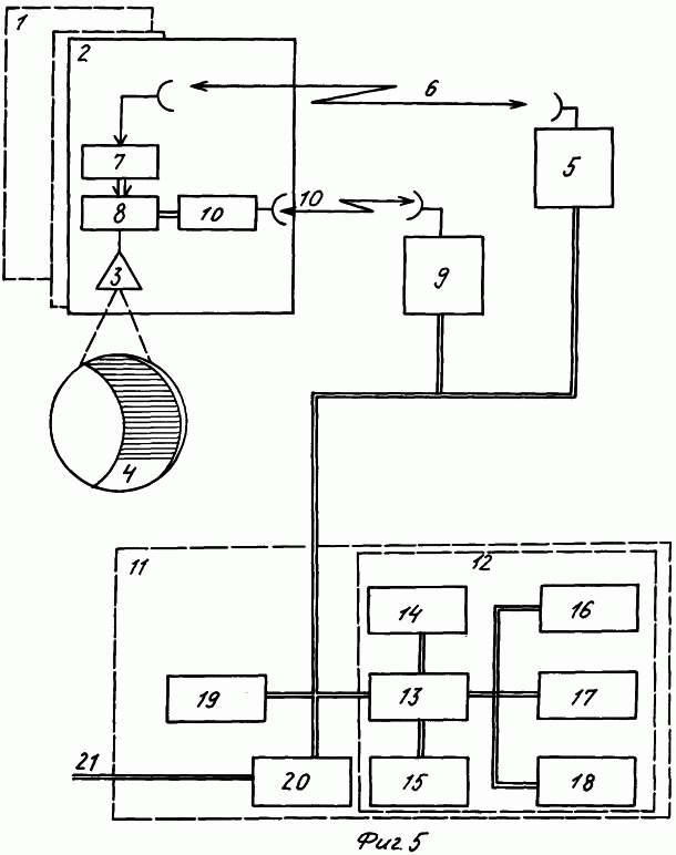 Заявленный способ может быть реализован по схеме фиг.5. Функциональная схема устройства фиг.5 содержит орбитальную группировку 1 космических аппаратов 2 (типа “Вулкан”) с установленными на каждом из них ионозондами 3 (типа “ИС-388”), осуществляющими зондирование ионосферы в полосе 4. Полоса зондирования 4 обеспечивается движением КА 2 по орбите. Включение ионозонда 3 над заданным районом наблюдения осуществляется по программе или по разовым командам, передаваемым из Центра управления системой 5 по радиолинии управления 6 в бортовой комплекс управления 7. Получаемые выборки измерений функций fкр (L) и fкр (H) записываются в бортовой магнитофон 8 и в сеансах видимости КА 2 с наземных пунктов приема информации 9 по автономной телеметрической радиолинии 10 передается в аналитический центр 11. Обработку полученной информации по операциям заявленного способа осуществляют на персональной ЭВМ 12 в стандартном наборе элементов: процессора-вычислителя 13, оперативного ЗУ 14, винчестера 15, дисплея 16, принтера 17, клавиатуры 18. Результаты обработки в виде идентифицированных сейсмоионосферных аномалий и расчетные параметры ожидаемого удара помещают в Базу данных 19 и выводят на сервер 20 сети “Интернет” 21.
